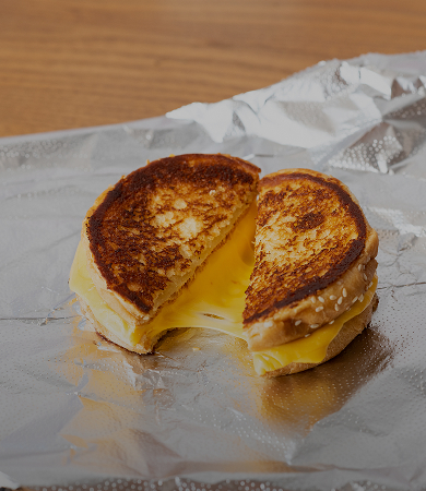 A slice of American-style cheese melted between fresh egg fried on the grill and topped with slices of apple-wood smoked bacon. All this placed on a soft, toasted sesame seed bun and served with as many toppings as you want.